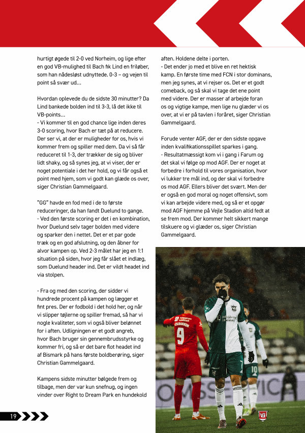 Hvordan oplevede du de sidste 30 minutter? Da Lind bankede bolden ind til 3-3, lå det ikke til VB-points …- Vi kommer til en god chance lige inden deres 3-0 scoring, hvor Bach er tæt på at reducere. Der ser vi, at der er muligheder for os, hvis vi kommer frem og spiller med dem. Da vi så får reduceret til 1-3, der trækker de sig og bliver lidt shaky, og så synes jeg, at vi viser, der er noget potentiale i det her hold, og vi får også et point med hjem, som vi godt kan glæde os over, siger Christian Gammelgaard.