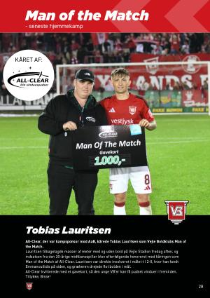 All-Clear , der var kampsponsor mod AaB , kårede Tobias Lauritsen som Vejle Boldklubs Man of the Match . Lauritsen tilbagelagde masser af meter med og uden bold på Vejle Stadion fredag aften , og indsatsen fra den 20-årige midtbanespiller blev efterfølgende honoreret med kåringen som Man of the Match af All-Clear . Lauritsen var direkte involveret i målet til 2-0 , hvor han fandt Emmanouilidis på siden , og grækeren drejede flot bolden i mål . All-Clear kvitterede med et gavekort , så den unge VB ’ er kan få pudset vinduer i fremtiden . Tillykke , Bisse !
