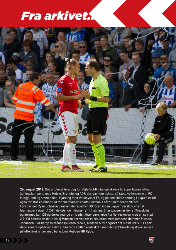26. august 2018: Det er blevet hverdag for Vejle Boldklubs oprykkere til Superligaen. Efter åbningskampene mod Hobro, Brøndby og AGF, der gav fem points, så tabte vejlenserne til FC Midtjylland og smed point i Hjørring mod Vendsyssel FF, og på den sidste søndag i august er OB også for stor en mundfuld for cheftræner Adolfo Sormanis hårdt kæmpende VB’ ere. Først er det Ryan Johnson Laursen der sparker OB foran inden Jeppe Tverskov efter et hjørnespark øger til 2-0 i de døende minutter af 1. halvleg. Efter pausen er der stillingskrig og dermed kan OB og deres mange stribede tilhængere rejse fra Nørreskoven med en sejr på 2-0. På billedet er det Nicolaj Madsen der vender en situation med kampens dommer Michael Johansen. For netop midtbanespilleren Nicolaj Madsen blev opgøret det sidste for VB. Et par dage senere ophævede den rutinerede spiller kontrakten med de rødblusede og skrev senere på efteråret under med barndomsklubben HB Køge.