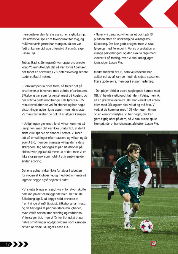 - Vi skulle bruge en sejr, hvis vi for alvor skulle hale ind på de foranliggende hold. Det skulle Silkeborg også, så begge hold prøvede at fremtvinge et mål til sidst. Silkeborg har mest, og de har også et par halvstore muligheder, hvor Vekić har en stor redning og redder os. Vi forsøger lidt, men vi får for lidt ud at et par halve omstillinger og dødboldene som kampen er ved at rinde ud, siger Lasse Flø.