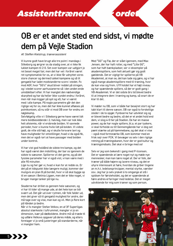 Vi møder nu OB, som vi både har besejret stort og har tabt klart til denne sæson. OB var også to forskellige steder i de to opgør. Fynboerne har udviklet sig og er blevet bedre og bedre, så det er et andet hold end dem, vi slog 4-0 her på Stadion. De har en masse power, og de har nogle spillere, bl. a. et par tyskere, vi skal forholde os til! Gennemgående har vi dog set pænt stærke ud på hjemmebane, og det skal vi vise – også mod formstærke OB, som kommer med en frisk sejr over FCK. Vi bevæger os selv i den rigtige retning på træningsbanen, hvor der er god kultur og træningsindsats. Det skal vi bringe med os!