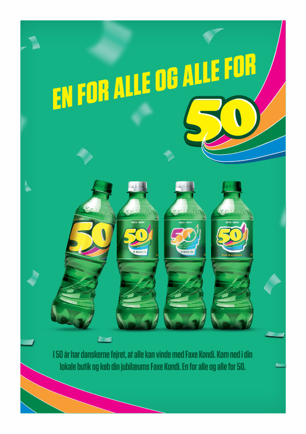I 50 år har danskerne fejret, at alle kan vinde med Faxe Kondi. Kom ned i din lokale butik og køb din jubilæums Faxe Kondi. En for alle og alle for 50.