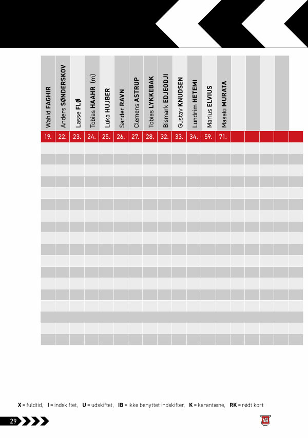 X = fuldtid, I = indskiftet, U = udskiftet, IB = ikke benyttet indskifter, K = karantæne, RK = rødt kort