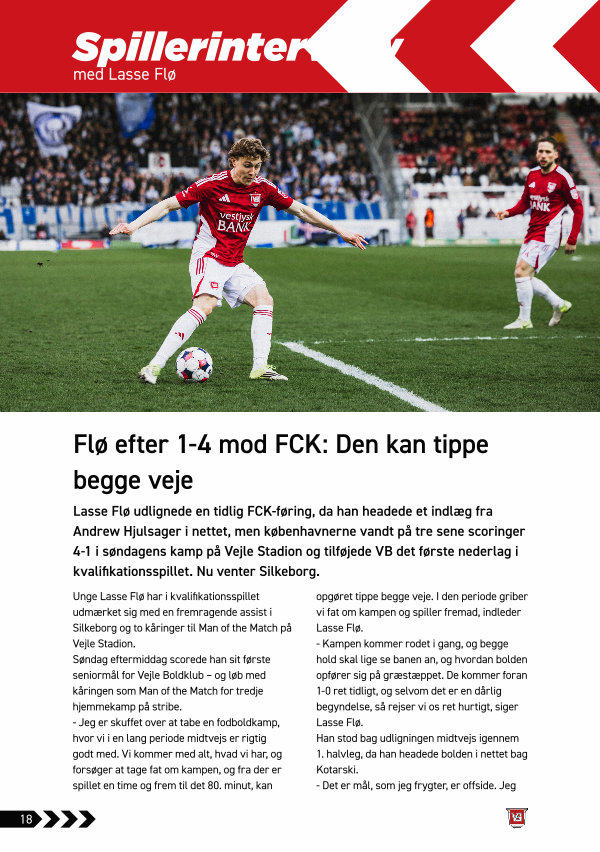 Unge Lasse Flø har i kvalifikationsspillet udmærket sig med en fremragende assist i Silkeborg og to kåringer til Man of the Match på Vejle Stadion. Søndag eftermiddag scorede han sit første seniormål for Vejle Boldklub – og løb med kåringen som Man of the Match for tredje hjemmekamp på stribe.- Jeg er skuffet over at tabe en fodboldkamp, hvor vi i en lang periode midtvejs er rigtig godt med. Vi kommer med alt, hvad vi har, og forsøger at tage fat om kampen, og fra der er spillet en time og frem til det 80. minut, kan opgøret tippe begge veje. I den periode griber vi fat om kampen og spiller fremad, indleder Lasse Flø.- Kampen kommer rodet i gang, og begge hold skal lige se banen an, og hvordan bolden opfører sig på græstæppet. De kommer foran 1-0 ret tidligt, og selvom det er en dårlig begyndelse, så rejser vi os ret hurtigt, siger Lasse Flø. Han stod bag udligningen midtvejs igennem 1. halvleg, da han headede bolden i nettet bag Kotarski.- Det er mål, som jeg frygter, er offside. Jeg