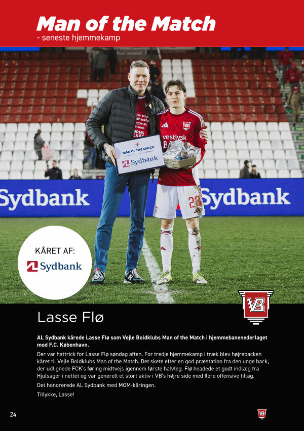 Der var hattrick for Lasse Flø søndag aften. For tredje hjemmekamp i træk blev højrebacken kåret til Vejle Boldklubs Man of the Match. Det skete efter en god præstation fra den unge back, der udlignede FCK’ s føring midtvejs igennem første halvleg. Flø headede et godt indlæg fra Hjulsager i nettet og var generelt et stort aktiv i VB’ s højre side med flere offensive tiltag.