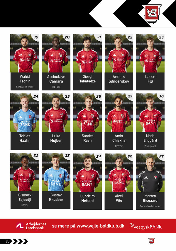 se mere på www. vejle-boldklub. dk 24 Tobias Haahr 25 Luka Hujber 26 Sander Ravn 32 Bismark Edjeodji HETEK 19 Wahid Faghir Sandwich n’ More 34 Lundrim Hetemi 22 Anders Sønderskov 20 Abdoulaye Camara HETEK 23 Lasse Flø 29 Amin Chiakha HETEK 80 Alexi Pitu FT Morten Bisgaard Førsteholdstræner 30 Mads Enggård Prof-profil 21 Giorgi Tabatadze 33 Gustav Knudsen 35
