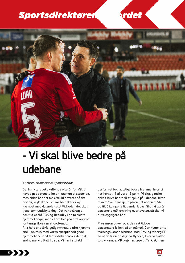 Det har været et skuffende efterår for VB. Vi havde gode præstationer i starten af sæsonen, men siden har det for ofte ikke været på det niveau, vi ønskede. Vi har haft skader og kæmpet med dalende selvtillid, uden det skal tjene som undskyldning. Det var selvsagt positivt at slå FCK og Brøndby i de to sidste hjemmekampe, men ellers har præstationerne for længe ikke været godkendt. Alle hold er selvfølgelig normalt bedre hjemme end ude, men med vores exceptionelt gode hjemmebane med fantastiske fans er det nok endnu mere udtalt hos os. Vi har i alt fald performet betragteligt bedre hjemme, hvor vi har hentet 11 af vore 13 point. Vi skal ganske enkelt blive bedre til at spille på udebane, hvor man måske skal spille på en lidt anden måde og tilgå kampene lidt anderledes. Skal vi opnå sæsonens mål omkring overlevelse, så skal vi blive dygtigere her.