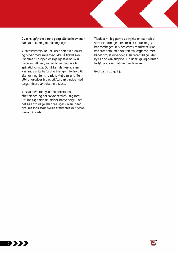 Til sidst vil jeg gerne udtrykke en stor tak til vores fortrinlige fans for den opbakning, vi har modtaget, selv om vores resultater ikke har stået mål med støtten fra lægterne. Med håbet om, at vi vender stærkere tilbage i det nye år og kan angribe 3F Superliga og dermed forfølge vores mål om overlevelse.