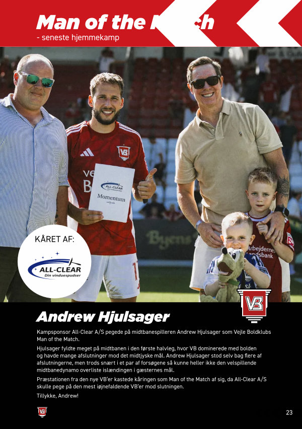 Kampsponsor All-Clear A / S pegede på midtbanespilleren Andrew Hjulsager som Vejle Boldklubs Man of the Match.