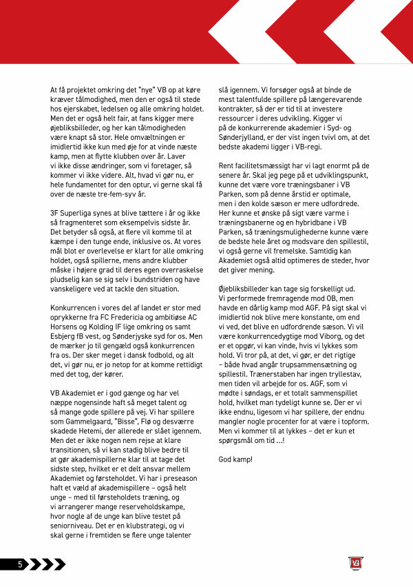 At få projektet omkring det” nye” VB op at køre kræver tålmodighed, men den er også til stede hos ejerskabet, ledelsen og alle omkring holdet. Men det er også helt fair, at fans kigger mere øjebliksbilleder, og her kan tålmodigheden være knapt så stor. Hele omvæltningen er imidlertid ikke kun med øje for at vinde næste kamp, men at flytte klubben over år. Laver vi ikke disse ændringer, som vi foretager, så kommer vi ikke videre. Alt, hvad vi gør nu, er hele fundamentet for den optur, vi gerne skal få over de næste tre-fem-syv år.