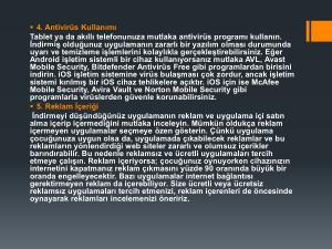 • 4 . Antivirüs Kullanımı Tablet ya da akıllı telefonunuza mutlaka antivirüs programı kullanın . Ġndirmiş olduğunuz uygulamanın zararlı bir yazılım olması durumunda uyarı ve temizleme işlemlerini kolaylıkla gerçekleştirebilirsiniz . Eğer Android işletim sistemli bir cihaz kullanıyorsanız mutlaka AVL , Avast Mobile Security , Bitdefender Antivirüs Free gibi programlardan birisini indirin . iOS işletim sistemine virüs bulaşması çok zordur , ancak işletim sistemi kırılmış bir iOS cihaz tehlikelere açıktır . iOS için ise McAfee Mobile Security , Avira Vault ve Norton Mobile Security gibi programlarla virüslerden güvenle korunabilirsiniz .