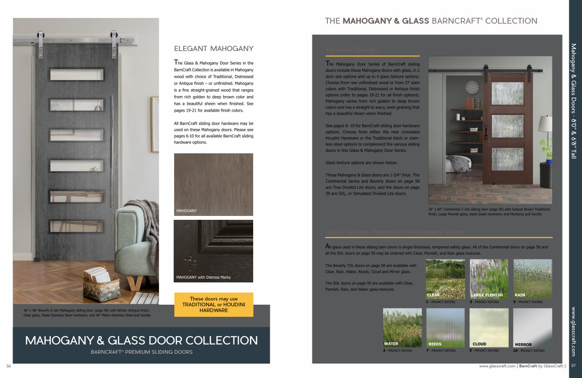 The Glass & Mahogany Door Series in the BarnCraft Collection is available in Mahogany wood with choice of Traditional, Distressed or Antique finish – or unfinished. Mahogany is a fine straight-grained wood that ranges from rich golden to deep brown color and has a beautiful sheen when finished. See pages 19-21 for available finish colors.