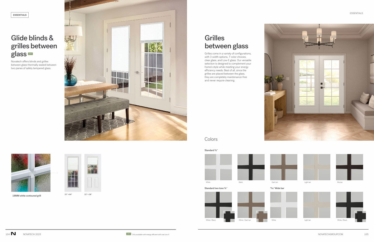 Grilles come in a variety of configurations, with 3 width options, 7 color choices, clear glass, and Low-E glass. Our versatile selection is designed to complement your home’ s style while meeting your energy efficiency needs. Best of all, since the grilles are placed between the glass, they are completely maintenance-free and never require cleaning.