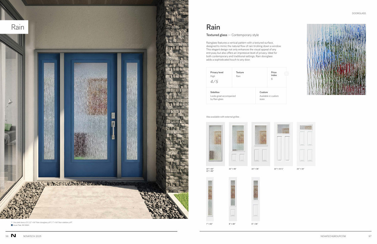 Rainglass features a vertical pattern with a textured surface, designed to mimic the natural flow of rain trickling down a window. This elegant design not only enhances the visual appeal of any entryway but also offers an impressive level of privacy. Ideal for both contemporary and traditional settings, Rain doorglass adds a sophisticated touch to any door.