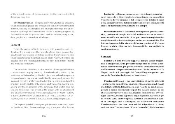 The arrival on the island is - for a visitor of average athleticism - quite complex , a quay made up of modeled rocks , beaten by the undertow , a climb on hand-chiseled , disconnected and steep steps between basalts dug out or overlooked by caves and ravines . Remains of corroded artifacts and technologies , writings and graffiti of prison guests , and then the ascent under an often beating sun , among scents and glimpses of the landscape that stretch over the sea and Ventotene . The arrival at the prison with its abandoned and dilapidated buildings leaves an impression of “ mort - subìte ”, of hasty and definitive abandonment as from a place that has exhausted , due to an excess of ferocity , its meaning and purpose .