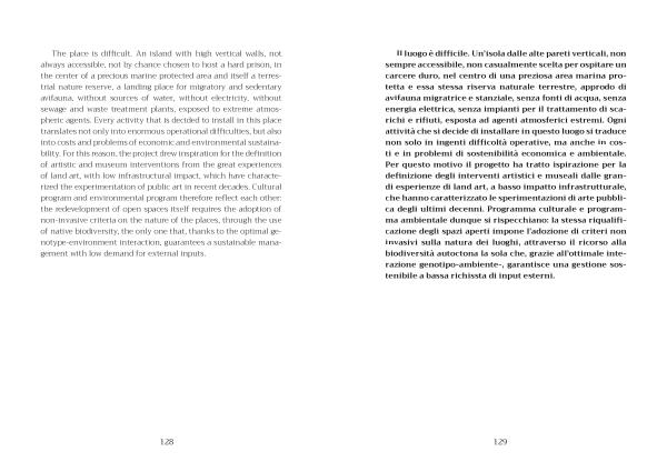 The place is difficult . An island with high vertical walls , not always accessible , not by chance chosen to host a hard prison , in the center of a precious marine protected area and itself a terrestrial nature reserve , a landing place for migratory and sedentary avifauna , without sources of water , without electricity , without sewage and waste treatment plants , exposed to extreme atmospheric agents . Every activity that is decided to install in this place translates not only into enormous operational difficulties , but also into costs and problems of economic and environmental sustainability . For this reason , the project drew inspiration for the definition of artistic and museum interventions from the great experiences of land art , with low infrastructural impact , which have characterized the experimentation of public art in recent decades . Cultural program and environmental program therefore reflect each other : the redevelopment of open spaces itself requires the adoption of non-invasive criteria on the nature of the places , through the use of native biodiversity , the only one that , thanks to the optimal genotype-environment interaction , guarantees a sustainable management with low demand for external inputs .