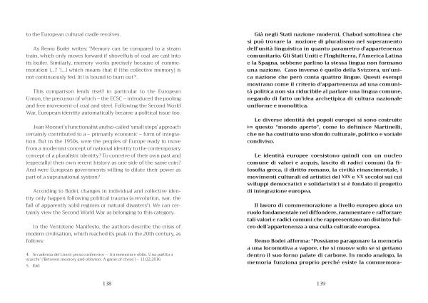 As Remo Bodei writes : ‘ Memory can be compared to a steam train , which only moves forward if shovelfuls of coal are cast into its boiler . Similarly , memory works precisely because of commemoration [...]’ ‘[...] which means that if [ the collective memory ] is not continuously fed , [ it ] is bound to burn out ’ 4 .