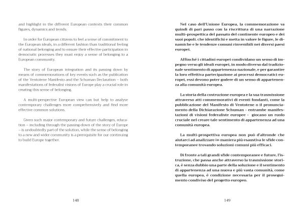 La storia della costruzione europea e la sua trasmissione attraverso atti commemorativi di eventi fondanti , come la pubblicazione del Manifesto di Ventotene o il pronunciamento della Dichiarazione Schuman - entrambe manifestazioni di visioni federaliste europee - giocano un ruolo cruciale nel creare tale sentimento di appartenenza ad una comunità europea .