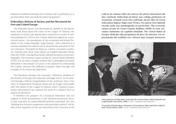 The federalist theory was discovered by Spinelli in his discussions with Rossi about the crisis of the League of Nations , the weakness of which had already been criticised in a series of articles published in 1919 in the Corriere della Sera signed by a mysterious Junius - the pseudonym of the economist and future President of the Italian Republic Luigi Einaudi - then collected in a volume published by Laterza which attracted the attention of the two internees . Prompted by Rossi as a fellow economics professor , Einaudi sent them some books on English federalist theory from the 1930s . Among these books , Spinelli mentions in his autobiography The Economic Causes of War by Lionel Charles Robbins ( 1939 ): in it we find a chapter entitled The United States of Europe , dedicated to the prospect of peace to be achieved by overcoming the conflict between the different European states through the example of the American Federation .