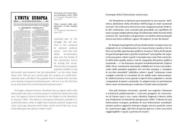 Nel Manifesto si dichiara precisamente la necessaria “ definitiva abolizione della divisione dell ’ Europa in stati nazionali sovrani ” da realizzarsi attraverso una riorganizzazione federale del continente , non essendo più pensabile un equilibrio di stati europei indipendenti dopo il fallimento della Società della nazioni che “ pretendeva di garantire un diritto internazionale senza una forza militare capace di imporre le sue decisioni ”.