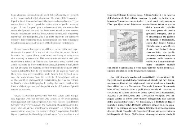 Eugenio Colorni , Ernesto Rossi , Altiero Spinelli e la nascita del Movimento federalista europeo . Le radici delle idee elaborate a Ventotene vanno indietro negli anni e attraversano l ’ Europa . Quei nomi hanno occupato finora tutto lo spazio della memoria pubblica ; sono parte di quella gioventù europea , che si è emancipata fra guerra di Spagna e Resistenza , come due donne , Ursula Hirschmann e Ada Rossi , il cui contributo è stato riconosciuto , ma tardivamente , e tuttora è poco presente nella memoria collettiva . Rimane da colmare l ’ enorme ritardo con cui si è cominciato a riconoscer loro un ruolo , com ’ è accaduto alle donne delle Resistenze europee .
