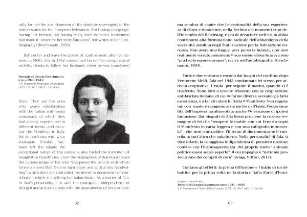 there . They are the ones who weave relationships with the Italian anti-fascist conspiracy , of which they had already experienced in different forms , and circulate the Manifesto in Italy . We do not know with what stratagem Ursula ’ s husband left the island ; the exceptional nature of the company also fueled the invention of imaginative hypotheses . From the biographers of Ada Rossi comes the curious image of her who “ sharpened the pencils with which Ernesto copied Manifesto in light paper and with a tiny handwriting ”, which does not contradict the intent to document her contribution which is anything but subordinate . As a matter of fact , in Ada ’ s personality , it is said , the courageous independence of thought and action coexists with the unawareness of her own role :