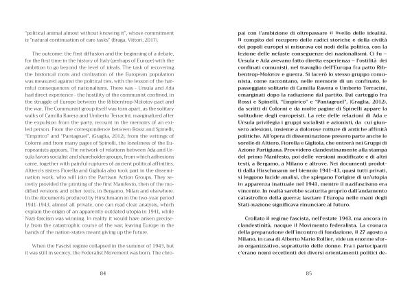 pa ) con l ’ ambizione di oltrepassare il livello delle idealità . Il compito del recupero delle radici storiche e della civiltà dei popoli europei si misurava coi nodi della politica , con la lezione delle nefaste conseguenze dei nazionalismi . Ci fu – Ursula e Ada avevano fatto diretta esperienza – l ’ ostilità dei confinati comunisti , nel travaglio dell ’ Europa fra patto Ribbentrop-Molotov e guerra . Si lacerò lo stesso gruppo comunista , come raccontano , nelle memorie di un confinato , le passeggiate solitarie di Camilla Ravera e Umberto Terracini , emarginati dopo la radiazione dal partito . Dal carteggio fra Rossi e Spinelli , “ Empirico ” e “ Pantagruel ”, ( Graglia , 2012 ), da scritti di Colorni e da molte pagine di Spinelli appare la solitudine degli europeisti . La rete delle relazioni di Ada e Ursula privilegia i gruppi socialisti e azionisti , da cui giunsero adesioni , insieme a dolorose rotture di antiche affinità politiche . All ’ opera di disseminazione presero parte anche le sorelle di Altiero , Fiorella e Gigliola , che entrerà nei Gruppi di Azione Partigiana . Provvidero clandestinamente alla stampa del primo Manifesto , poi delle versioni modificate e di altri testi , a Bergamo , a Milano e altrove . Nei documenti prodotti dalla Hirschmann nel biennio 1941-43 , quasi tutti privati , si leggono lucide analisi , che spiegano l ’ origine di un ’ utopia in apparenza inattuale nel 1941 , mentre il nazifascismo era vincente . In realtà sarebbe scaturita proprio dall ’ andamento catastrofico della guerra ; lasciare l ’ Europa nelle mani degli Stati-nazione significava rinunciare al futuro .