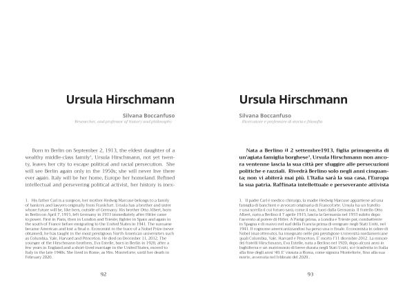 Nata a Berlino il 2 settembre1913 , figlia primogenita di un ’ agiata famiglia borghese 1 , Ursula Hirschmann non ancora ventenne lascia la sua città per sfuggire alle persecuzioni politiche e razziali . Rivedrà Berlino solo negli anni cinquanta ; non vi abiterà mai più . L ’ Italia sarà la sua casa , l ’ Europa la sua patria . Raffinata intellettuale e perseverante attivista