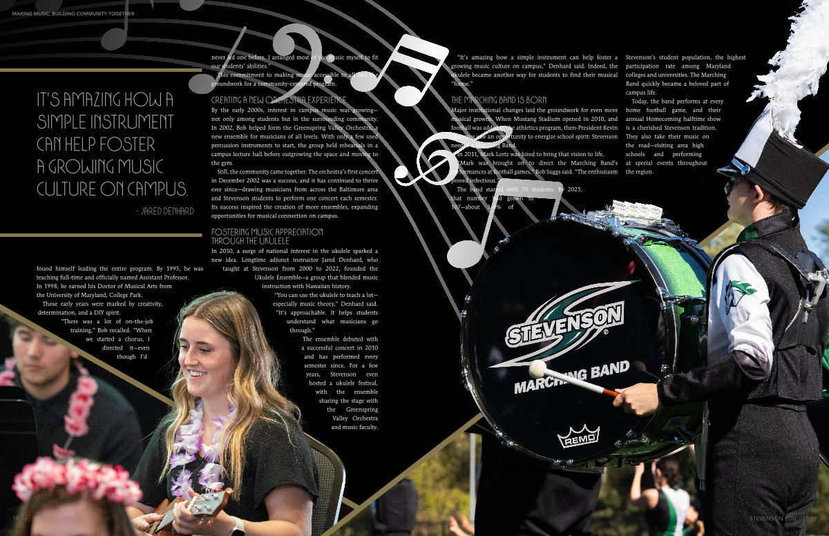 In 2010, a surge of national interest in the ukulele sparked a new idea. Longtime adjunct instructor Jared Denhard, who taught at Stevenson from 2000 to 2022, founded the Ukulele Ensemble— a group that blended music instruction with Hawaiian history.“ You can use the ukulele to teach a lot— especially music theory,” Denhard said.“ It’ s approachable. It helps students understand what musicians go through.” The ensemble debuted with a successful concert in 2010 and has performed every semester since. For a few years, Stevenson even hosted a ukulele festival, with the ensemble sharing the stage with the