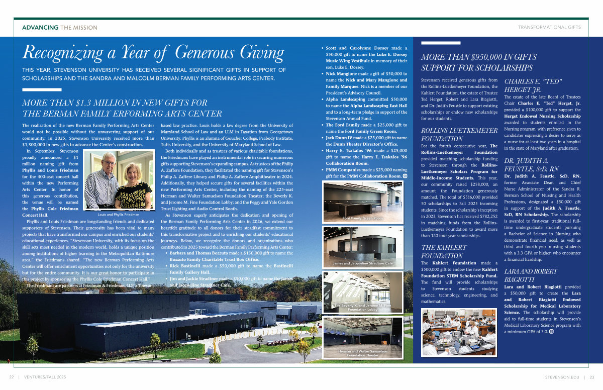 THIS YEAR, STEVENSON UNIVERSITY HAS RECEIVED SEVERAL SIGNIFICANT GIFTS IN SUPPORT OF SCHOLARSHIPS AND THE SANDRA AND MALCOLM BERMAN FAMILY PERFORMING ARTS CENTER.