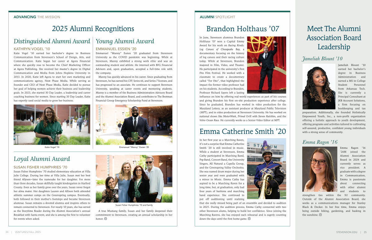 Susan Fisher Humphries’ 70 studied elementary education at Villa Julie College. During her time at Villa Julie, Susan met her best friend Allyson— later the namesake for her daughter. For more than three decades, Susan skillfully taught kindergarten in Harford County. Even as her family grew over the years, Susan never forgot her alma mater. Her daughters Lauren and Allison both attended athletic summer camps on the Greenspring campus. Eventually, both followed in their mother’ s footsteps and became Stevenson alumnae. Susan remains a devoted alumna and inspires others to remain connected to Stevenson. For nearly 10 years, she has served as the Storytime Reader during the Alumni Association’ s annual Breakfast with Santa event, and she is among the first to volunteer for events when asked.