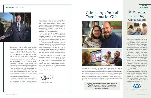 This issue of Ventures reaches you as we near the end of summer and look forward to the start of our 2023-2024 Academic Year . There is great excitement and optimism as this will be the year when many changes and enhancements to our campus come to fruition and become part of the Stevenson experience .
