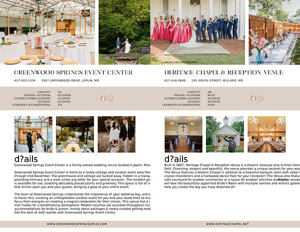 Built in 1887 , Heritage Chapel & Reception Venue is a Historic treasure only 6 miles from Springfield . Charming , elegant and beautiful , the venue provides a unique location for your wedding day . The Venue features a Historic Chapel in addition to a beautiful banquet room with cedar beams , crystal chandeliers and a hardwood dance floor for your reception ! The Venue also features a private courtyard for outdoor ceremonies or a space for outdoor activities during the reception . Brides will love the beautifully appointed Bride ’ s Room with multiple vanities and mirrors galore . Let us help you create the day you have dreamed of !