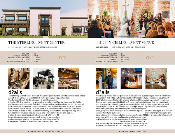The Sterling Event Center is one of three venues located at The Emerald Event Centers in Joplin , MO . It ’ s modern architecture and industrial look stand out from other barn venues in the Southwest Missouri area . It has a two-room construction that makes it a one-stop location for getting ready , ceremonies and receptions , hosting up to 400 people . The black , sleek look of the venue paired with it ’ s brick walls gives your wedding day a bold look unlike anything the area has to offer . Side balconies provide extra space for guests and lead to an outside deck that overlooks the outdoor ceremony area with a pergola and small pond in the background . With over 40 acres of property surrounding the venue , including beautiful fields and mature trees , you are sure to have endless photo opportunities .