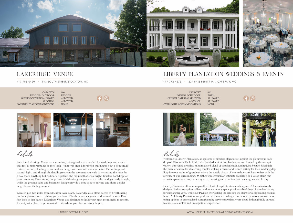 Located just two miles from Stockton Lake Dam, Lakeridge also offers access to breathtaking outdoor photo spots— giving you the best of both indoor elegance and natural beauty. From first look to last dance, Lakeridge Venue was designed to hold your most meaningful moments. It ' s not just a place to get married— it’ s where your forever story begins.