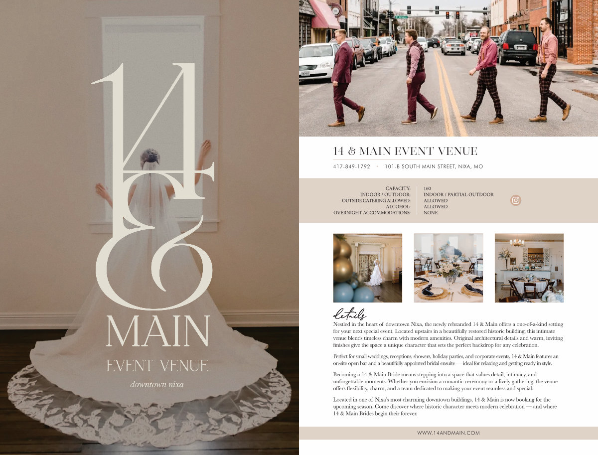 Located in one of Nixa’ s most charming downtown buildings, 14 & Main is now booking for the upcoming season. Come discover where historic character meets modern celebration— and where 14 & Main Brides begin their forever.