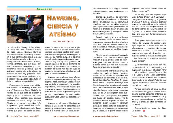 Probablemente hayas oído del libro más vendido de Hawking, A Brief History of Time – Una Breve Historia del Tiempo, en el que trata de explicar el origen y futuro del universo. No hace muchos años escribió con Leonard Mlodinow The Grand Design – El Gran Diseño, en el que se preguntaba:“¿ Es el aparente“ gran diseño” de nuestro universo evidencia de un creador benevolente que puso las cosas en movimiento u ofrece la ciencia otra explicación? Aunque el libro no abre nuevos campos científicos, recibió gran cantidad de atención porque Hawking dio a conocer su inclinación hacia el ateísmo con afirmaciones generales como estas:“ Porque hay una ley de la gravedad, el universo pudo y se creó a sí mismo de la nada”, y“ la creación espontánea es la razón por la que hay algo en lugar de nada … el porqué existe el universo, y el porqué existimos nosotros”.