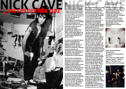 La obra de Cave también explora terrenos inaccesibles para muchos, conquistando las páginas mudas de los libros, el movimiento de las historias narradas en pantallas y cantando el deus ex machina con honestidad sólo comparable a la de Leonard Cohen, Bob Dylan o Johnny Cash, con quienes comparte lazos de inmortalidad.