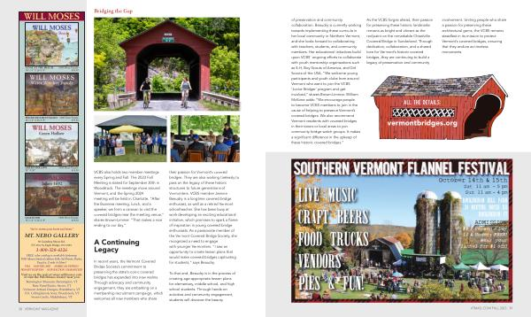 VCBS also holds two member meetings every Spring and Fall . The 2023 Fall Meeting is slated for September 30th in Woodstock . The meetings move around Vermont , and the Spring 2024 meeting will be held in Charlotte . “ After the Business meeting , lunch , and a speaker , we form a caravan to visit the covered bridges near the meeting venue ,” shares Brown-Limmer . “ That makes a nice ending to our day .”