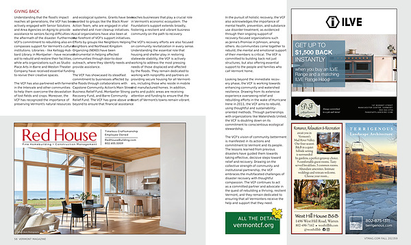 The VCF ’ s vision of community betterment is manifested in its actions and commitment to Vermont and its people . The lessons learned from previous disasters have guided them towards taking effective , decisive steps toward relief and recovery . Drawing on the collective strength of community and institutional partnership , the VCF embraces the multifaceted challenges of disaster recovery with thoughtful compassion . The VCF continues to act as a committed partner and advocate in the quest of rebuilding a thriving , resilient Vermont , and they remain dedicated to ensuring that all Vermonters receive the help and support that they need .