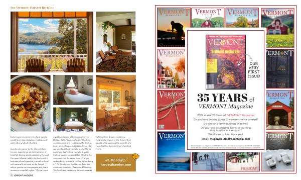 2024 marks 35 Years of VERMONT Magazine ! Do you have favorite stories or moments we ’ ve covered ? Do you run a family buisness or an Inn ? Do you have an amazing , funny , or touching story to tell about Vermont ?