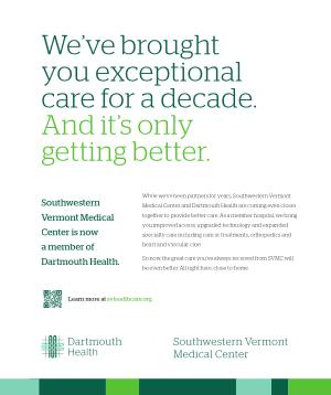 While we ’ ve been partners for years , Southwestern Vermont Medical Center and Dartmouth Health are coming even closer together to provide better care . As a member hospital , we bring you improved access , upgraded technology and expanded specialty care including cancer treatments , orthopedics and heart and vascular care .