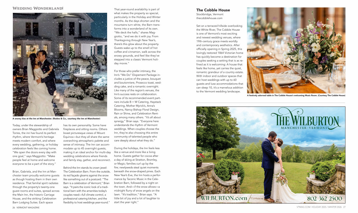Today, under the stewardship of owners Brian Maggiotto and Gabriela Torres, the inn has found its perfect rhythm, where Vermont’ s heritage meets modern comfort, and where every wedding, gathering, or holiday celebration feels like coming home.“ We open the doors every day with one goal,” says Maggiotto:“ Make people feel at home and welcome everyone to be a part of the story.”
