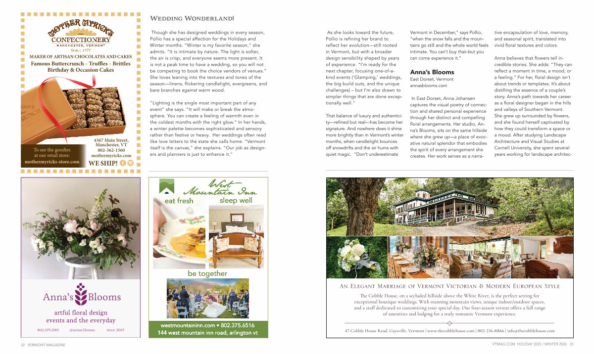 802.379.1583 @ annas. blooms since 2007 westmountaininn. com • 802.375.6516 144 west mountain inn road, arlington vt