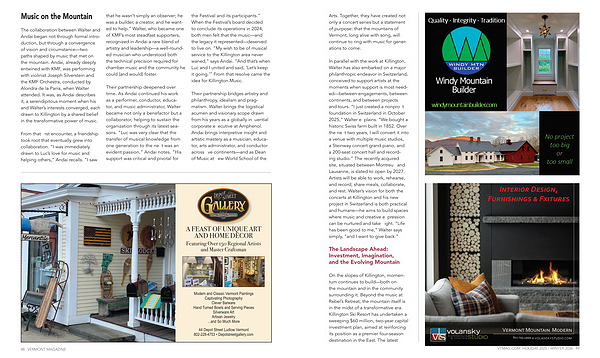 Their partnership deepened over time. As Andai continued his work as a performer, conductor, educator, and music administrator, Walter became not only a benefactor but a collaborator, helping to sustain the organization through its latest seasons.“ Luc was very clear that the transfer of musical knowledge from one generation to the next was an evident passion,” Andai notes.“ His support was critical and pivotal for the Festival and its participants.” When the Festival’ s board decided to conclude its operations in 2024, both men felt that the music— and the legacy it represented— deserved to live on.“ My wish to be of musical service to the Killington area never waned,” says Andai.“ And that’ s when Luc and I united and said,‘ Let’ s keep it going.’” From that resolve came the idea for Killington. Music.