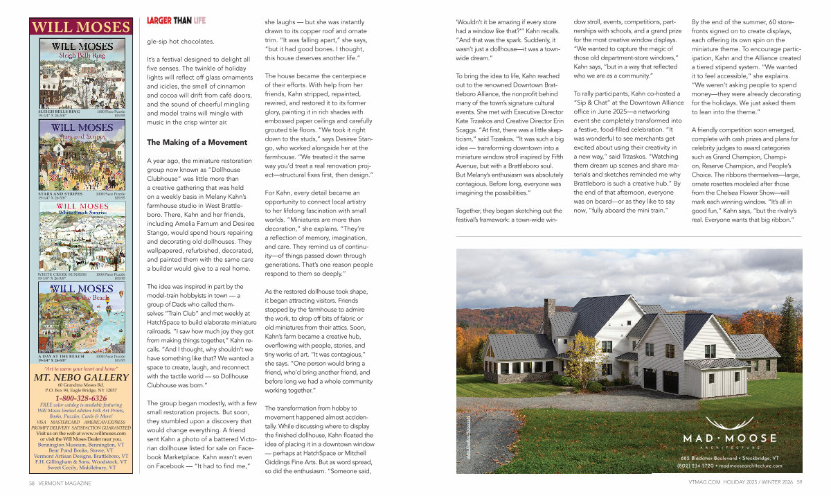 For Kahn, every detail became an opportunity to connect local artistry to her lifelong fascination with small worlds.“ Miniatures are more than decoration,” she explains.“ They’ re a reflection of memory, imagination, and care. They remind us of continuity— of things passed down through generations. That’ s one reason people respond to them so deeply.”