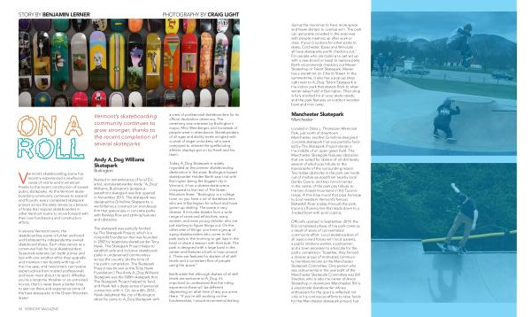 In several Vermont towns , the skateboarding scene is further anchored and bolstered by independently-owned skateboard shops . Each shop serves as a communal hub for local skateboarders . Seasoned veterans can trade stories and tips with one another while they upgrade and maintain their boards with top-ofthe-line gear , and newcomers can receive expert advice from trusted professionals and learn more about the sport . Whether you ’ re a longtime thrasher or an untrained novice , there ’ s never been a better time to get out there and experience some of the best skateparks in the Green Mountain State !