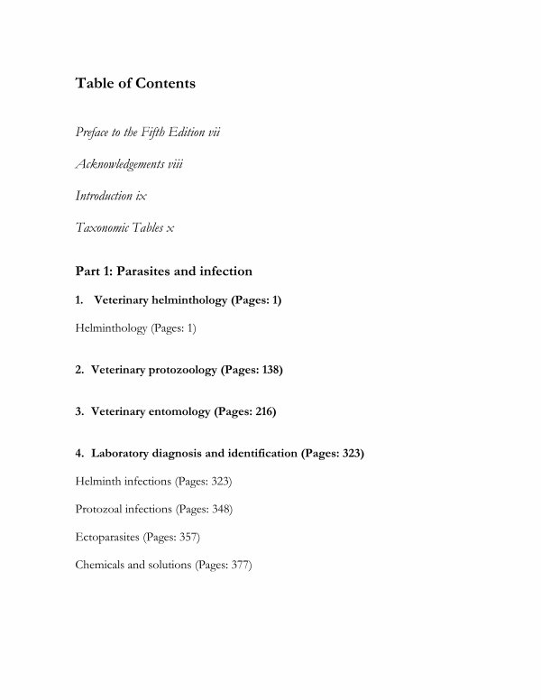 4. Laboratory diagnosis and identification( Pages: 323) Helminth infections( Pages: 323) Protozoal infections( Pages: 348) Ectoparasites( Pages: 357) Chemicals and solutions( Pages: 377)