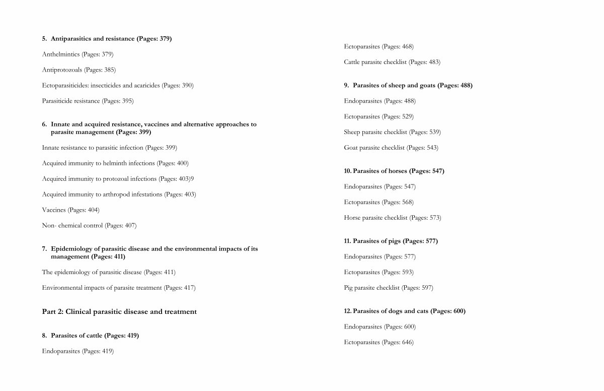 Innate resistance to parasitic infection( Pages: 399) Acquired immunity to helminth infections( Pages: 400) Acquired immunity to protozoal infections( Pages: 403) 9 Acquired immunity to arthropod infestations( Pages: 403) Vaccines( Pages: 404) Non- chemical control( Pages: 407)