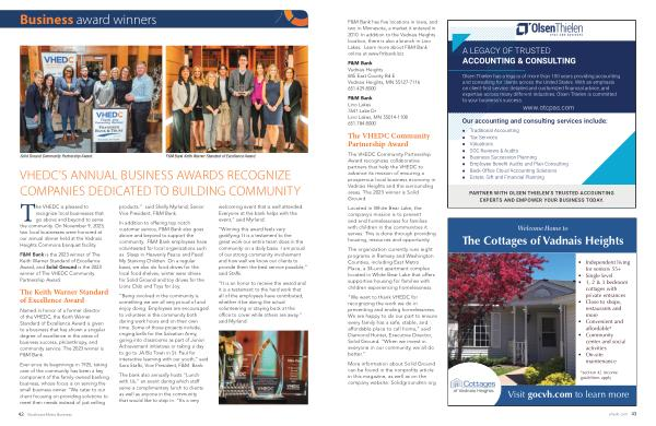 The VHEDC Community Partnership Award recognizes collaborative partners that help the VHEDC to advance its mission of ensuring a prosperous local business economy in Vadnais Heights and the surrounding areas . The 2023 winner is Solid Ground .